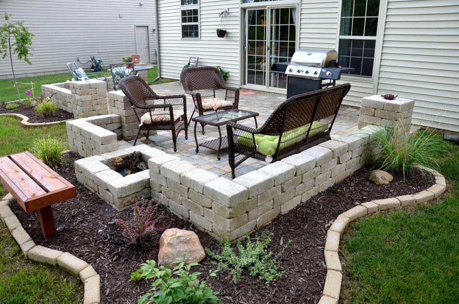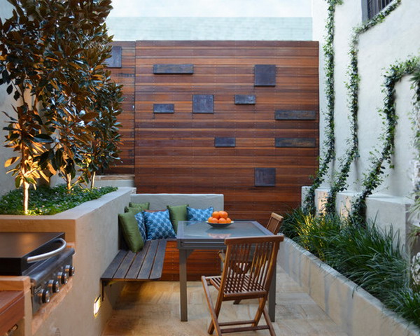 Patio designs incorporating built-in seating with pergolas and outdoor fireplaces look very chic and transform the patio into an outdoor room. It is also a great way to make use of all available space in a very small garden. This solution is convenient if you don’t want to shuffle around with garden furniture. However, the position of the seating is fixed and restricts how you can use the patio. The space is less flexible as seating cannot be varied to turn a dining area into a lounging area.